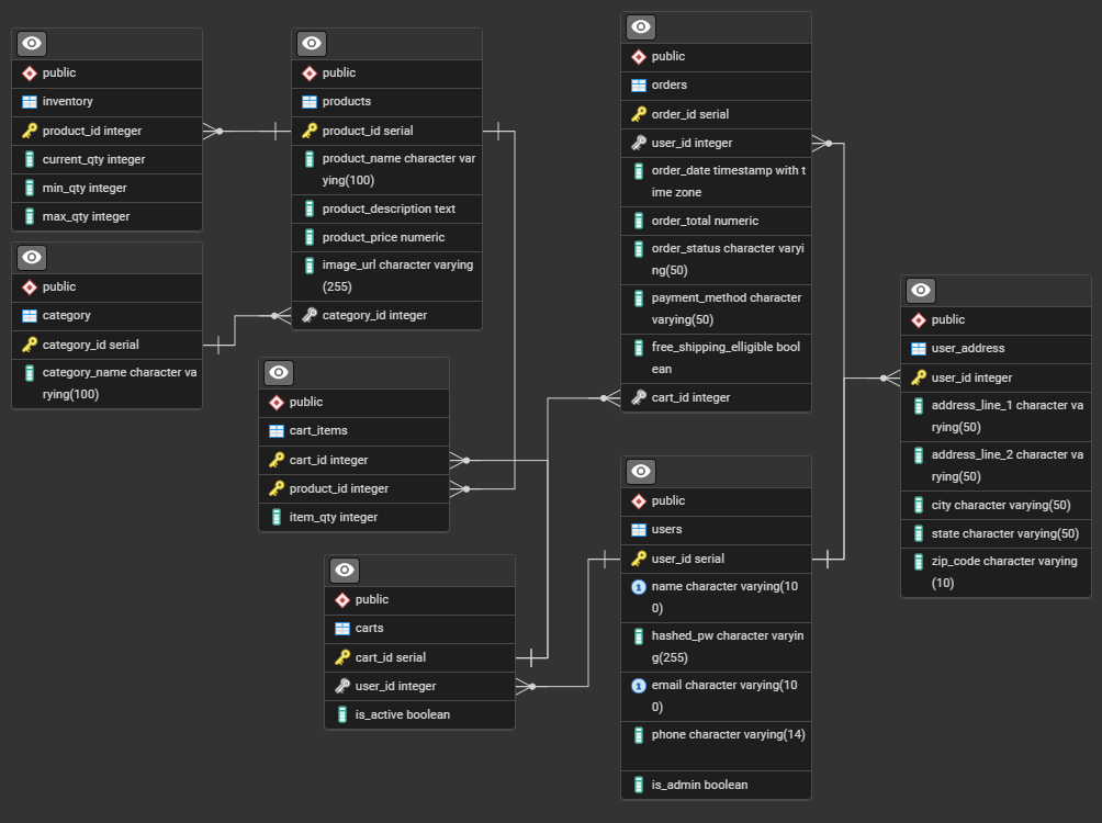 Let's talk database. I use Postgres, both locally and through Heroku which is who is hosting this site. Here is my entity relationship diagram, you can click on it for a larger more readable version.